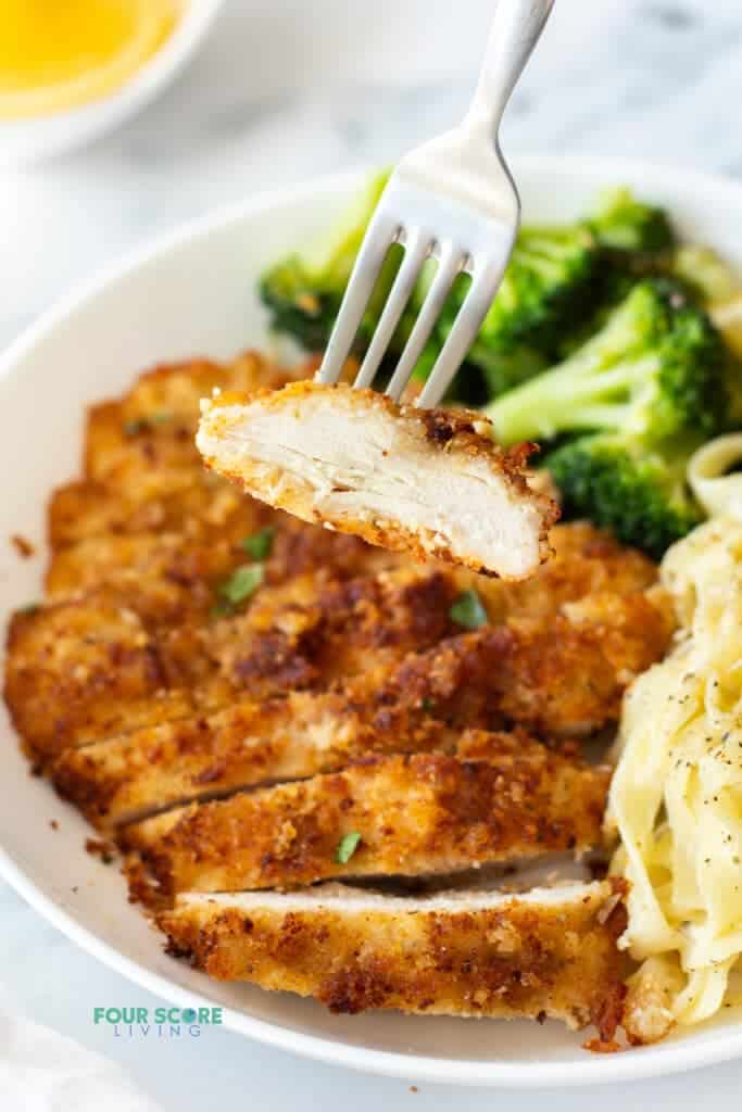 Thinly sliced chicken breasts are coated in seasoned breadcrumbs, parmesan, and fried in oil to make the perfect crispy chicken. Then served over pasta with a creamy asiago alfredo sauce.