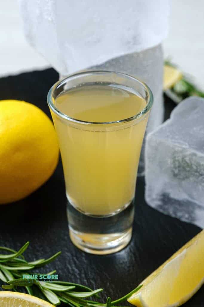 - Strain into a 2 oz shot glass ¾ of the way and fill the rest with a splash of lemon-lime soda (optional).