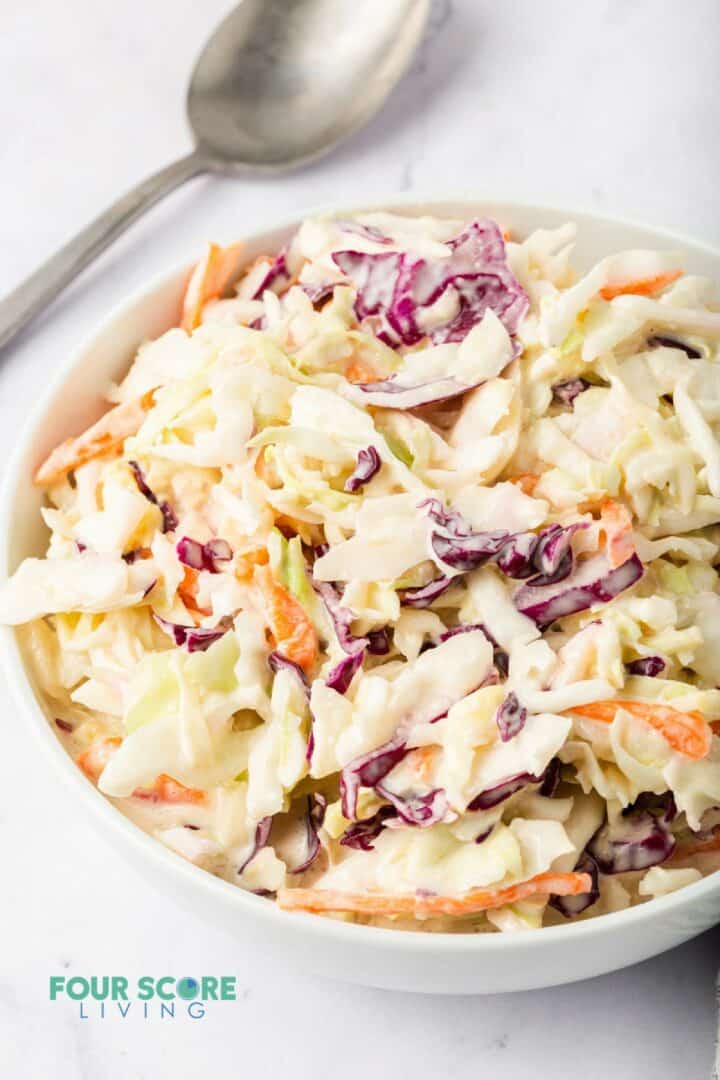 Keto Coleslaw is a versatile crunchy salad with a simple sweet and creamy dressing. This easy side dish goes great with BBQ and is perfect for potlucks or meal prep.