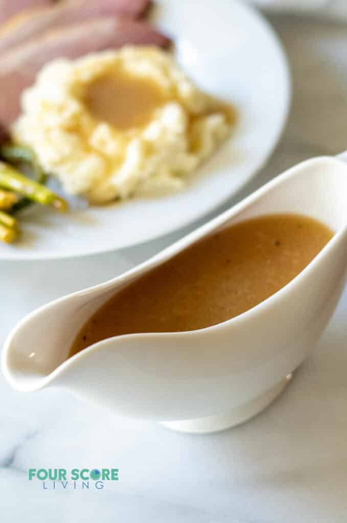 A keto gravy that only takes five minutes to make, has less than 1 carb per serving, and can be made with beef, chicken, turkey, or veggie broths, meat drippings, or bouillon cubes.