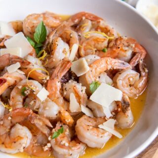 Step 8: Remove shrimp and white wine garlic butter sauce to a shallow dish or bowl. Garnish with Parmesan cheese and fresh basil as desired. Serve immediately.