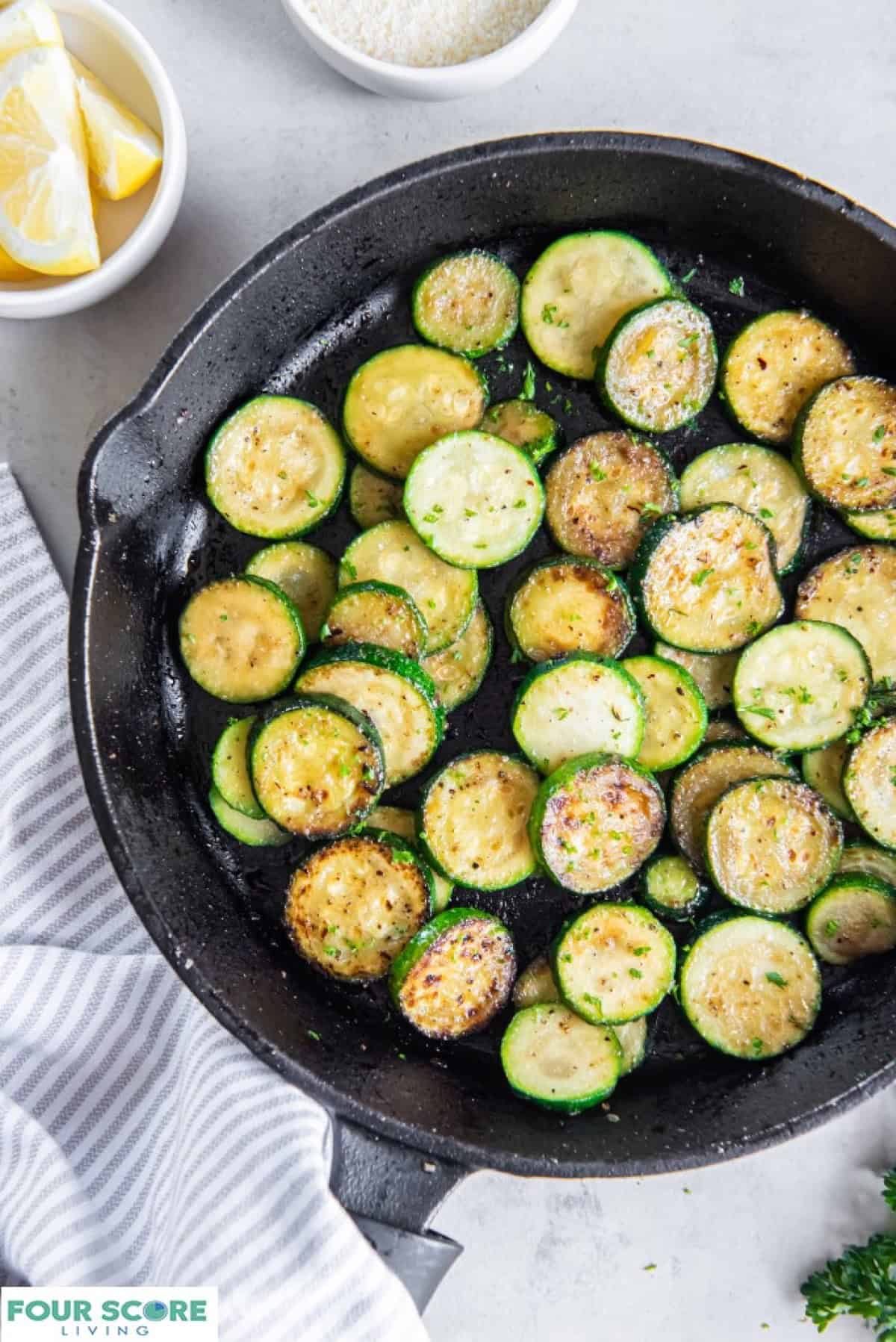 Freeze sauteed zucchini by arranging the slices into a single layer on a sheet pan to freeze and then transfer to a freezer bag. Remove as much air as possible from the freezer bag.