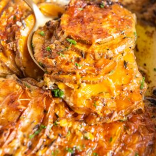 The sweet and savory flavors of these creamy scalloped sweet potatoes are perfectly balanced in a herbed cream sauce with parmesan and gruyere cheese.